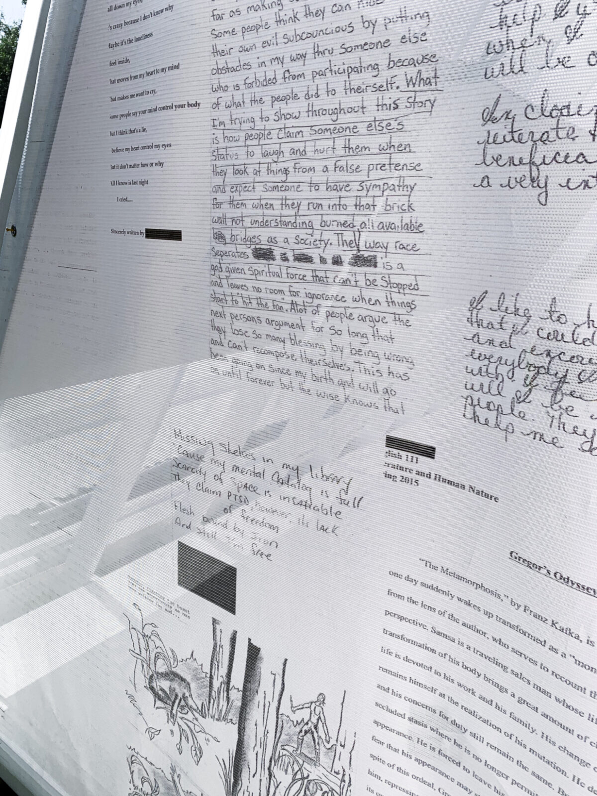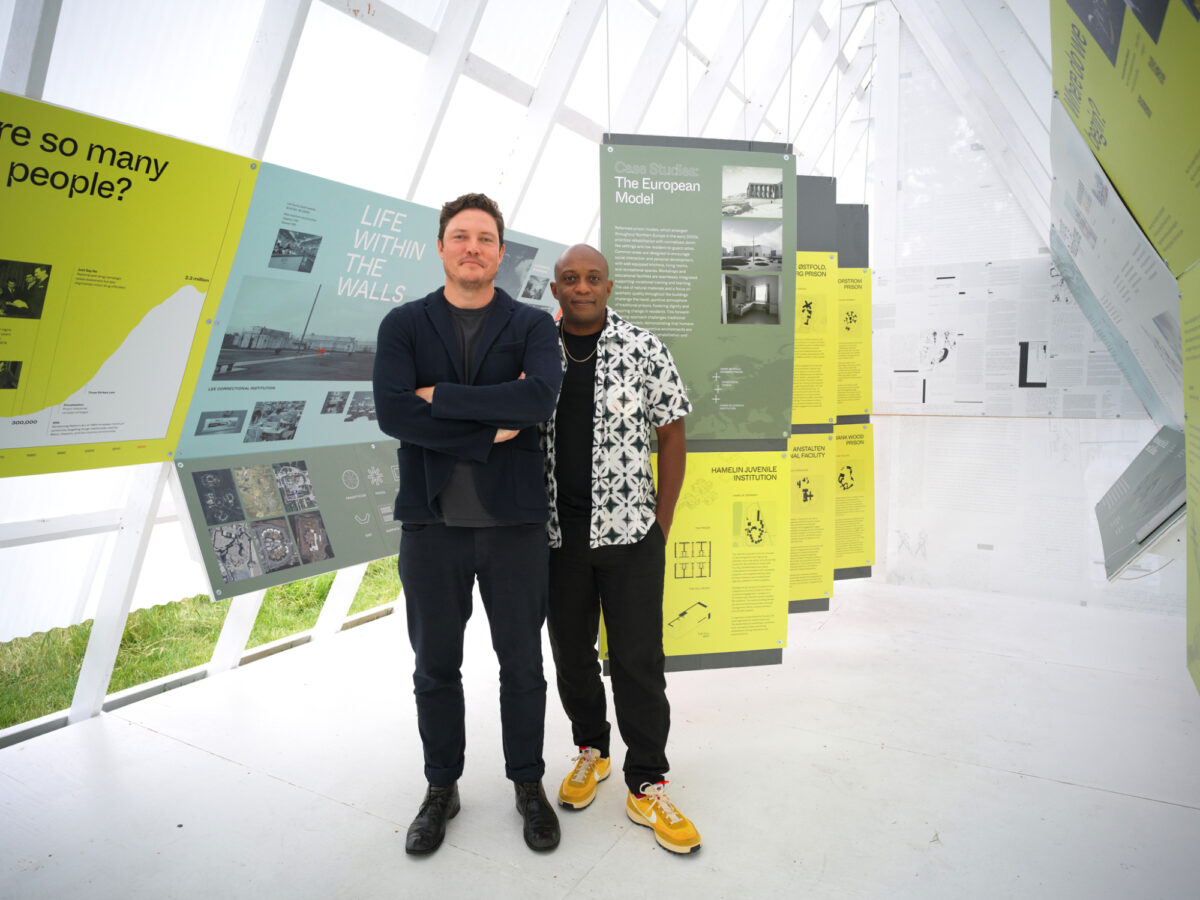 Set within a semi-transparent A-frame pavilion scaled to the dimensions of two standard prison cells, the installation traced the evolution of incarceration in the United States—a system defined by extraordinary scale, racial disparity, and isolation. Anchoring the space are written letters from prison collected by Dr. Baz Dreisinger in her broader Writings on the Wall installation.