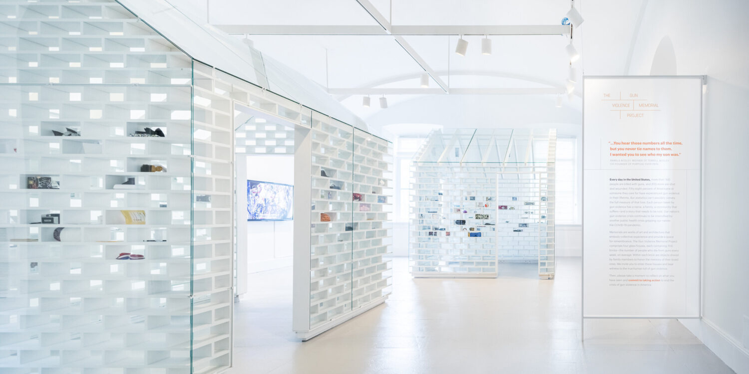 The Gun Violence Memorial Project was created to honor the thousands of lives cut short each year by gun violence in the United States. Four houses constructed of 700 clear glass bricks each, representing the average number of lives lost in a single week, are filled with remembrance objects — photographs, heirlooms, toys, or clothing — donated by families who have lost loved ones. Inside, visitors hear recorded stories and see portraits that bring forward the humanity behind the numbers.
