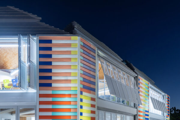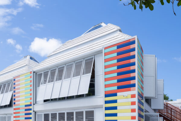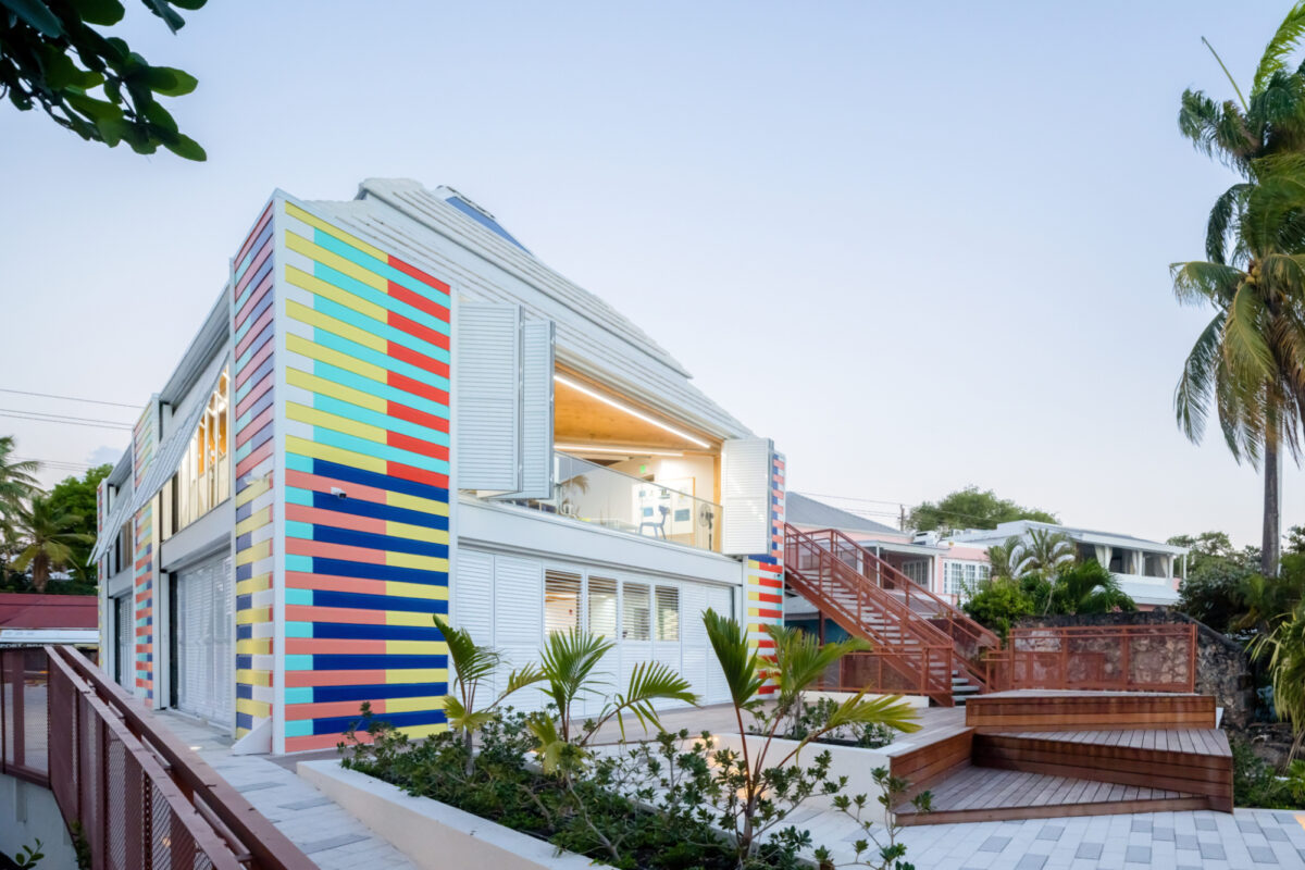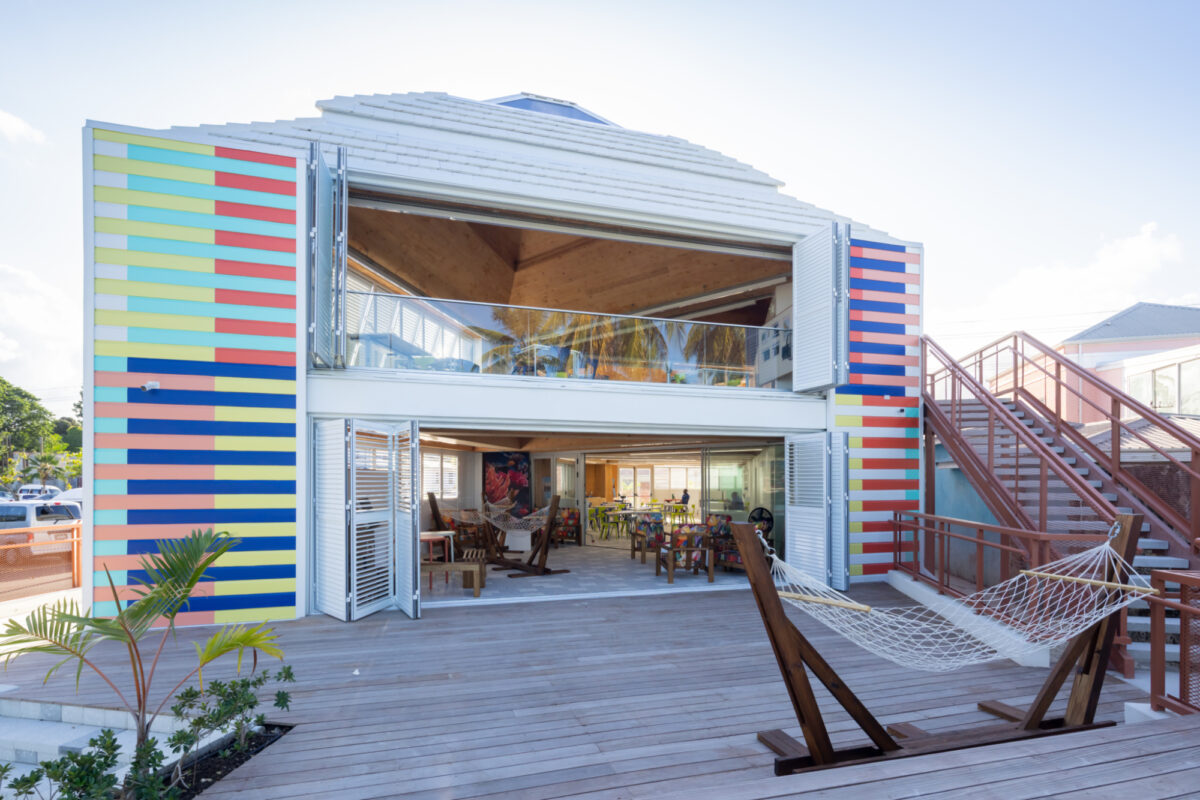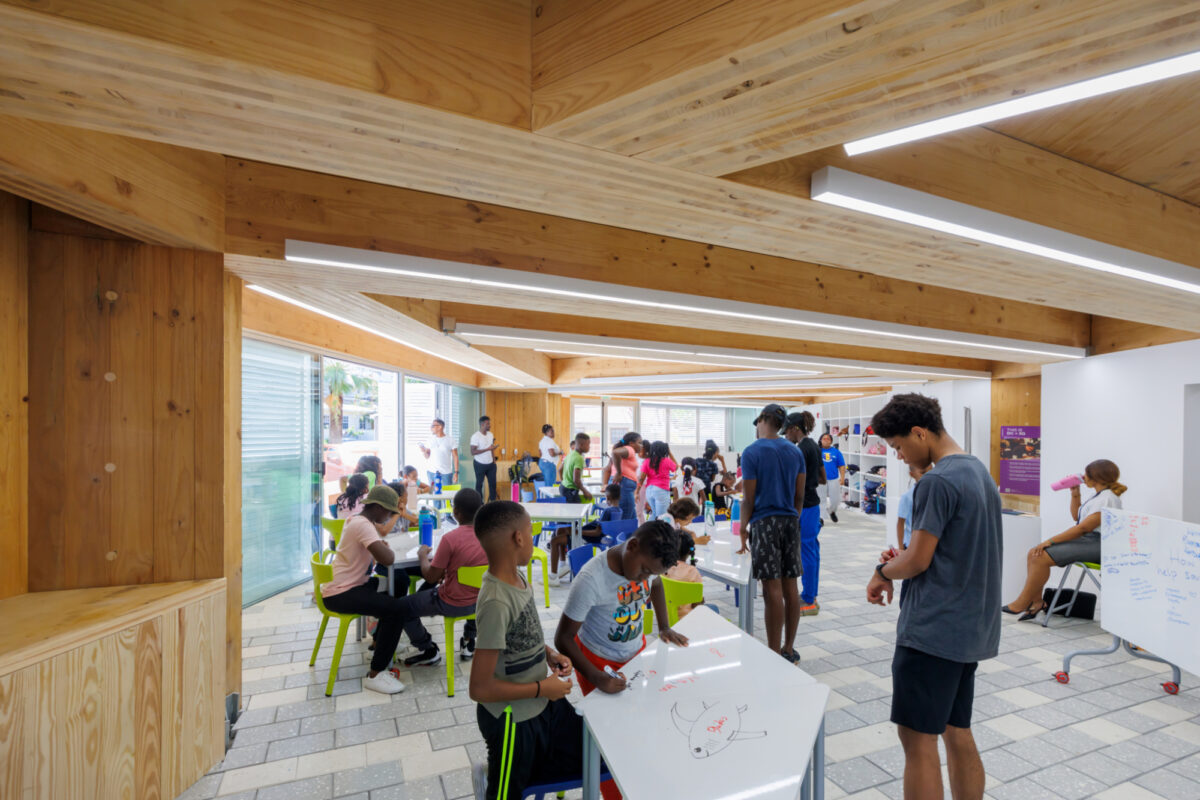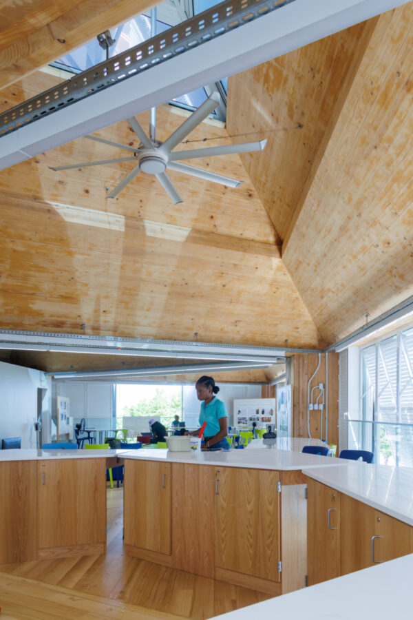 The mass timber module was developed and fabricated with Madrid-based Woho Systems and New Orleans-based architectural team OJT. Developed and deployed in rapid speed, the classroom is a prototype for future mass timber construction in the Caribbean. The building is clad in louvered accordion shutters and topped with operable skylights that harness prevailing ocean breezes, vent hot air, and modulate the near-constant Caribbean sun, creating shaded, comfortable interiors while significantly reducing energy loads.